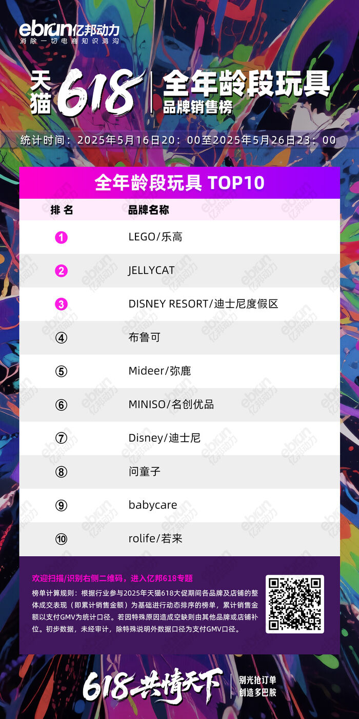 亿邦动力此前曾发布天猫618大促抢先购阶段前半程的TOP10榜单。和前半程榜单相比,婴童食品品牌榜的变化不大,依然是INNE、健敏思、英氏、天然博士、爷爷的农场为前五名。玩具潮玩品牌榜中,泡泡玛特由此前的第五名跃升至第二名,乐高、泡泡玛特、JELLYCAT为榜单TOP3。