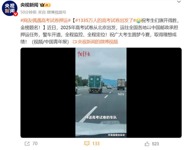据央视新闻报道,随着考试日期临近,近日,2025年高考试卷已从北京出发,运往全国各地,有多地网友在路上偶遇到了高考试卷押送车队。