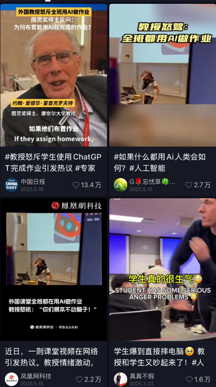 这些天,一段2023年的“教授怒骂AI作业”摆拍视频在国内突然爆火。“教授应该反思为什么只能布置出AI可以完成的作业”、“我儿子作业都是豆包帮他做的,我刚揍完他!”……视频下满是激情评论。