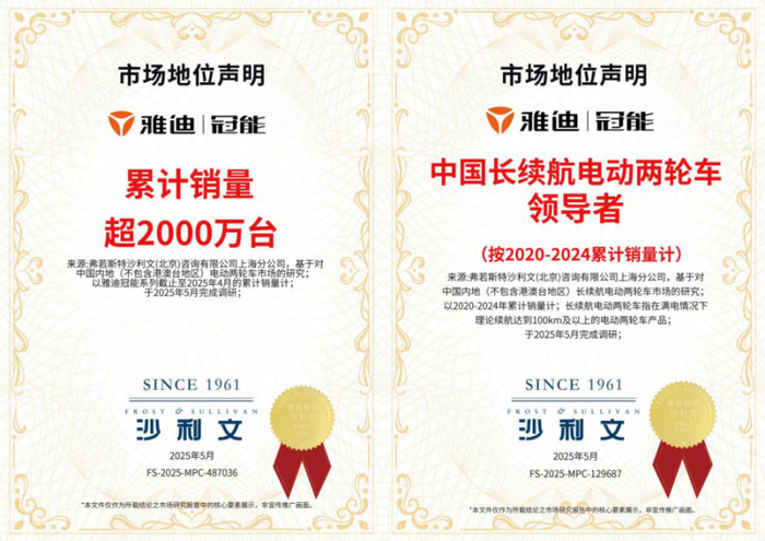 作为中国两轮电动车行业的领军品牌,雅迪以创新科技为核心驱动力,在长续航领域不断突破行业界限,让更多人享受到美好出行,赢得了超1亿用户的广泛青睐。雅迪冠能系列更是不断刷新两轮电动车的续航纪录。根据权威机构弗若斯特沙利文的调研认证,截至2025年4月,雅迪冠能系列累计销量突破2000万台,并荣获“中国长续航电动两轮车领导者”称号,这充分证明了全球用户对雅迪冠能系列长续航能力的高度认可。
