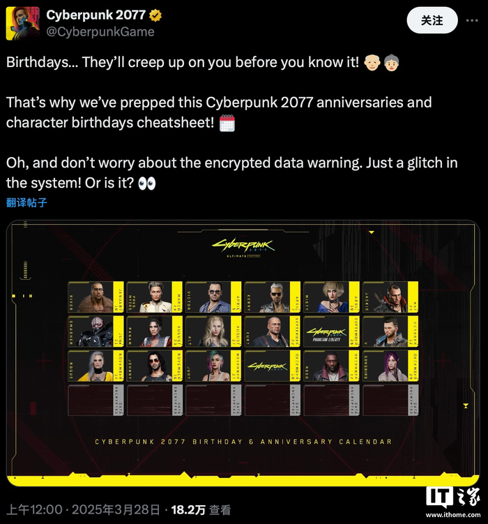 IT之家发现,《赛博朋克 2077》官方 X 账号曾在 3 月 28 日发布视频,其中包含六个标记为“加密数据”的隐藏角色,并配文“别在意加密数据警告,只是系统故障... 或者另有玄机?”