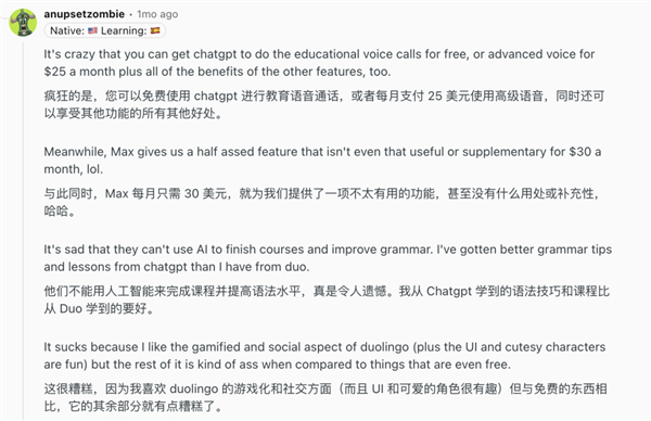 还有人觉得,反正都是跟AI学语言,为什么我不去找ChatGPT,更便宜而且能用的功能也更多。。。