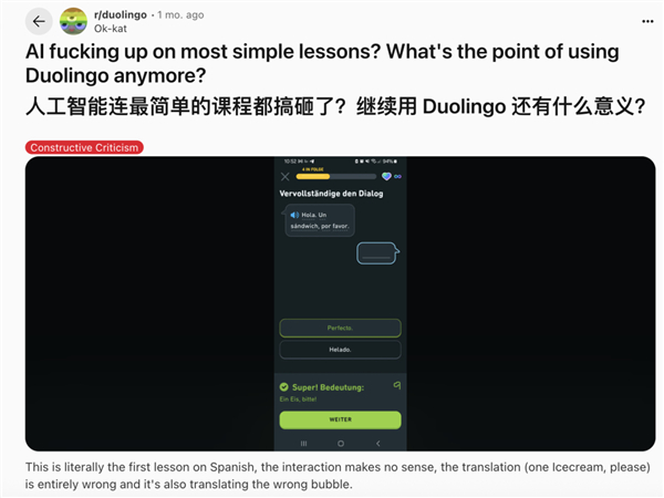 即使稍微宽容点的用户,也被多邻国的AI课程搞得烦了。