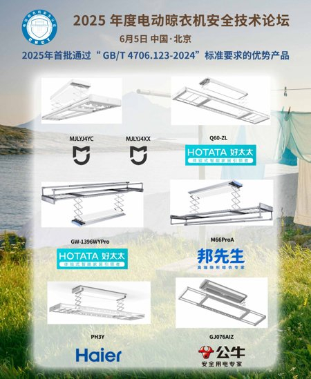 会上展示了7款首批通过GB/T 4706.123-2024《家用和类似用途电器的安全 第123部分:电动晾衣机的特殊要求》新国标技术要求的产品;同时也是获得2025年CHCT “电动晾衣机安全”认证的优势产品。获证产品分别是:米家牌智能晾衣机、HOTATA好太太牌智能晾衣机、邦先生牌电动晾衣架、Haier海尔牌智能电动晾衣机、公牛牌智能晾衣机。