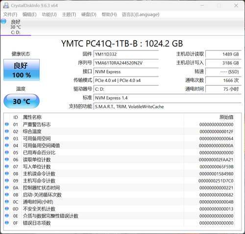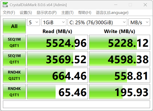 存储方面,1TB PICe 4.0 长江存储。实测顺序读取速度为 5524.96 MB/s,写入速度为 5228.12 MB/s,日常完全够用。