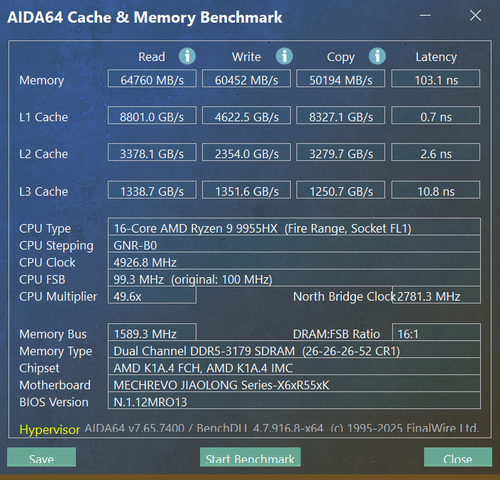 我们评测的这款机械革命蛟龙16 Pro 2025还搭载了32GB DDR5 5600MHz内存,使用AIDA64内存测试,读取速度为 64760 MB/s,写入速度为 60452 MB/s,延时为 103.1ns。