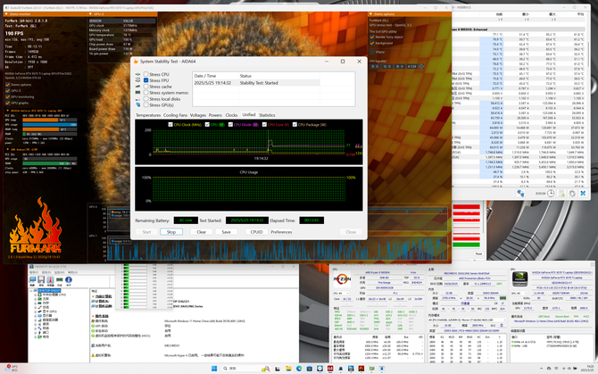整机功耗表现方面,同样的条件,测试可见,双烤模式下,CPU封装功率65W+,温度77°C,RTX 5070Ti GPU功耗释放为139W+,温度79°C,在十几分钟的烤机过程中,运行也非常稳定,可见机械革命蛟龙16 Pro 2025为核心硬件提供了充足的散热设计。