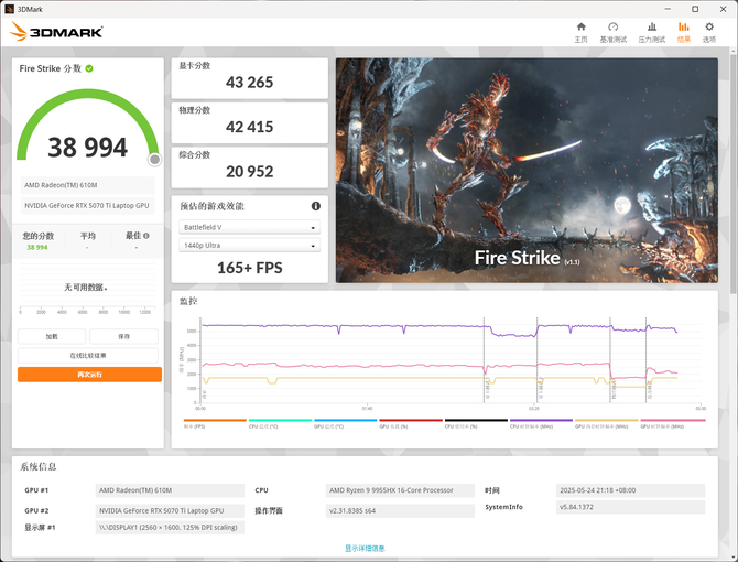Fire Strike 的测试中,显卡得分 43265,综合得分 38994。该项目主要用于评估显卡在 DirectX 11(DX11) 环境下的图形处理性能,覆盖从入门到高端的各类显卡,同时为主流游戏玩家和硬件评测参考。