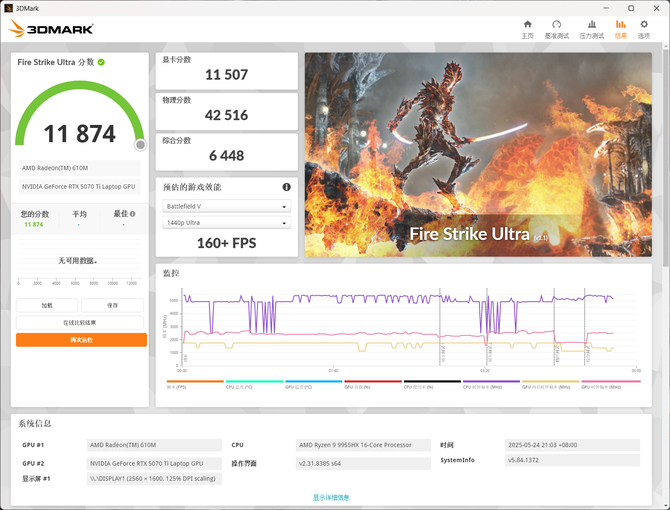 Fire Strike Ultra的测试中,显卡得分 11507,综合得分 11874。该测试项目是 3DMark 基准测试工具中的一项重要测试,主要用于评估显卡在 4K 分辨率(3840×2160)下的图形处理性能,尤其是针对 DirectX 11 游戏的渲染能力。