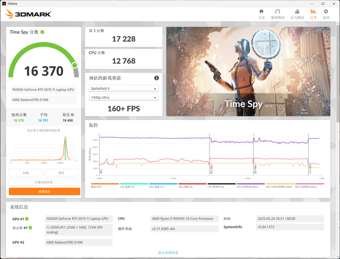 3DMark Time Spy 的测试中,显卡得分 17228,综合得分 16370。Time Spy是专门针对DirectX 12环境设计的测试项目,对于游戏玩家和图形设计师而言,Time Spy测试结果具有重要的参考价值。