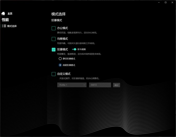 在最新版机械革命控制中心的性能模式选择里,我们选择狂暴模式,开启显卡超频,并设置为高能狂暴模式,这样就能保证可实现最大性能释放。对于有一定动手能力的,可以通过自定义模式调节适合的应用场景,比如性能或者安静模式,自由发挥度更大。