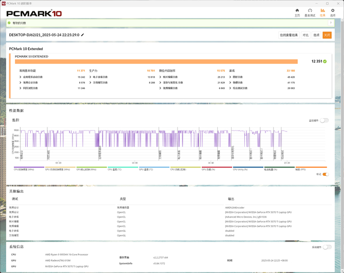 PCMark 10 Extended综合性能的跑分中,常用基本功能得分 11371,生产力得分 10701,数位内容创作得分 15575,游戏得分 33180,综合得分达到 12351,在单项的成绩中,这款机械革命蛟龙16 Pro 2025 在内容创作以及游戏中的表现,都相当不错。当然,应对日常办公也很轻松。