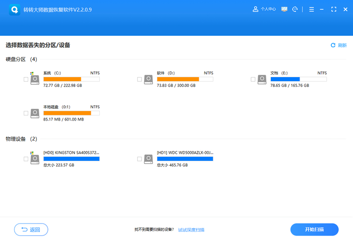 3.选择存储位置:点击数据丢失所在的硬盘分区或存储设备,比如数据原本在 C 盘就选 C 盘,在移动硬盘则选对应的移动硬盘盘符,然后点击开始扫描。