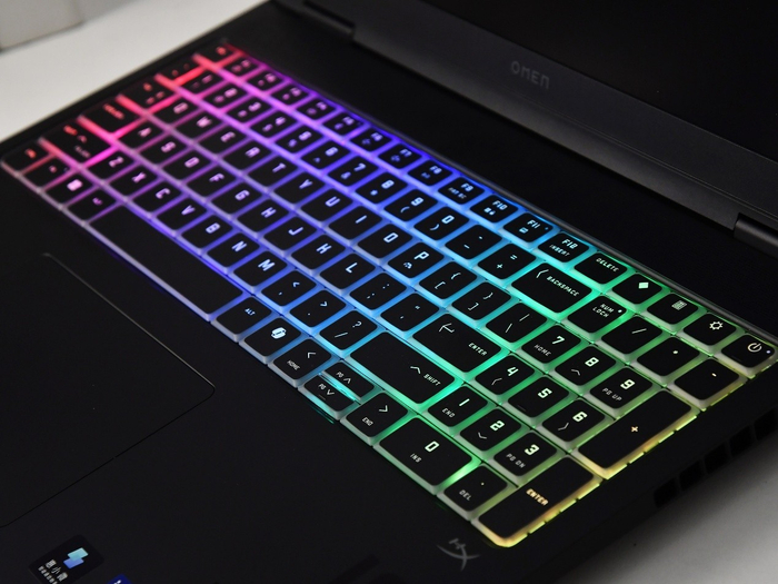 除此之外,OMEN暗影精灵MAX还有全键无冲、单键RGB的电竞键盘,前侧还有一条炫目的RGB灯带,视觉效果同样给力。