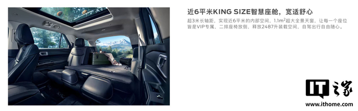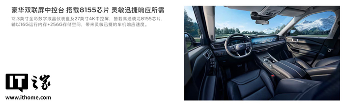 座舱方面,该车配备 12.3 英寸液晶仪表、27 英寸贯穿式 4K 分辨率中控屏幕,搭载高通骁龙 8155 芯片,匹配平底造型多功能方向盘、旋钮式换挡杆。带有全景天窗,前排使用隔音玻璃、后排使用隐私玻璃,内饰方面仅提供墨玉黑一种配色。