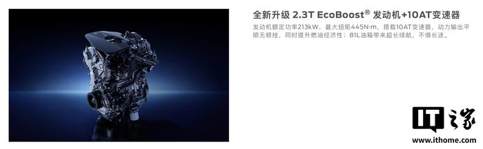 规格方面,该车长宽高分别为 5063x2004x1778 毫米,轴距为 3025 毫米。搭载 2.3T 发动机,最大功率为 213 千瓦,最大扭矩至 445 牛・米。传动系统匹配 10 速自动变速箱和纵置智能适时四驱系统,标配 81 升油箱。