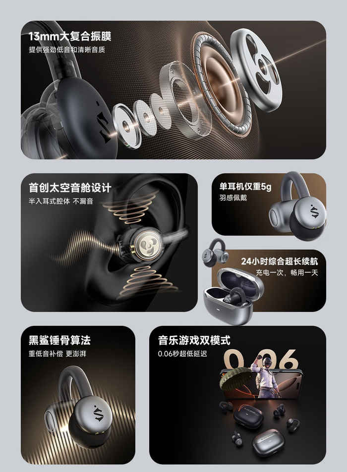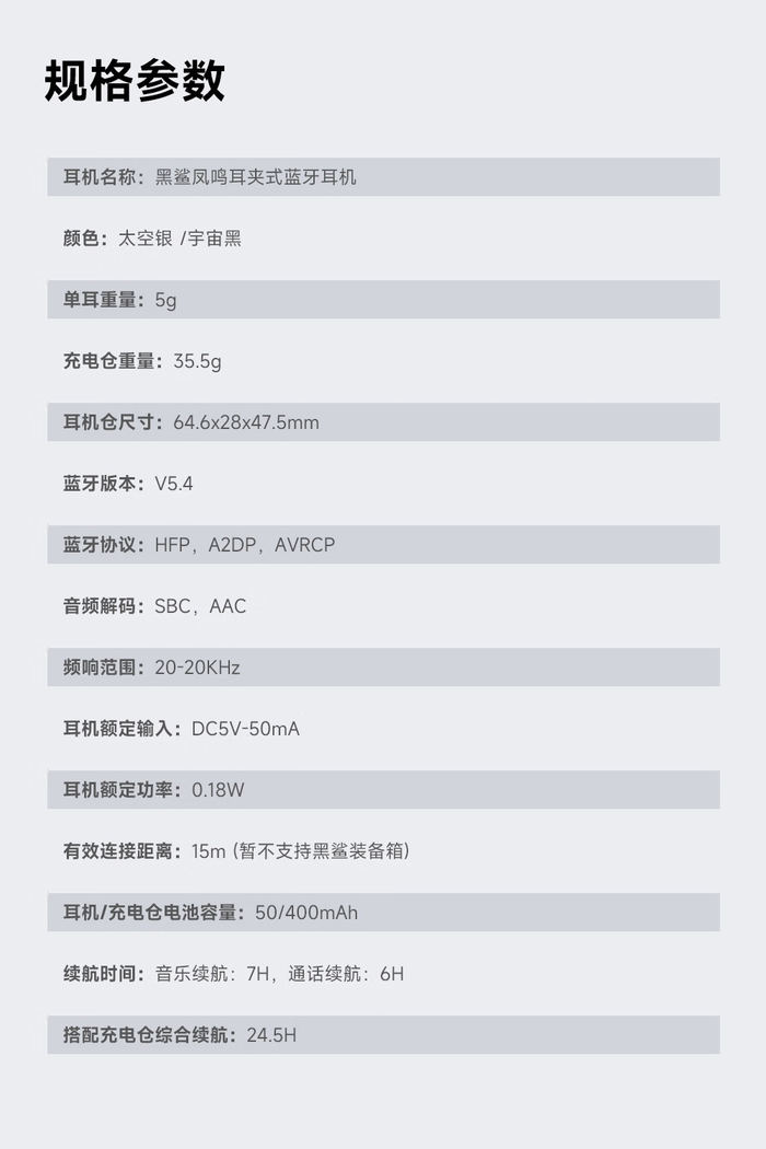 黑鲨凤鸣耳夹式蓝牙耳机首销:13mm 振膜、24.5 小时续航,169 元