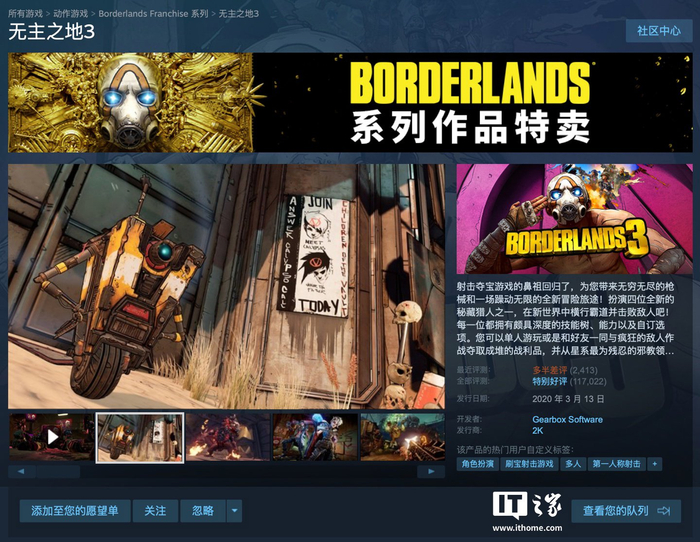 Steam 国区 9.95 元,经典游戏《无主之地 3》0.5 折新史低