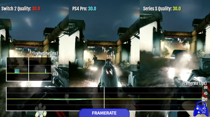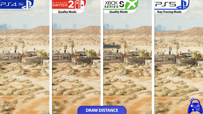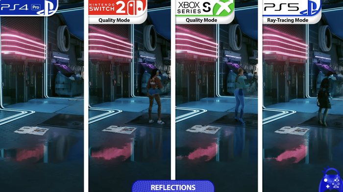对比 PS4 Pro,《赛博朋克 2077》在 PS4 Pro 平台最高 1188p 动态原生分辨率,但常降至 972p,同时存在帧率不稳现象;而 Switch 2 版本游戏虽然原始分辨率不高,不过得益于有 DLSS 加持将画质采样至 1080P 的同时,帧率整体更加稳定,此外 Switch 2 版游戏加载时间为 PS4 Pro 一半,不过不及 PS5 版游戏。
