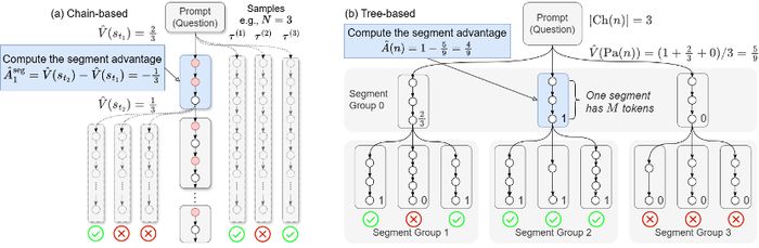 b)树形优势值估计 (Tree-based): 在长思维链场景下,MC 估计的代价很高,团队提出了一种高效的树形估计方法:将采样轨迹组织成树形结构,通过自底向上的奖励聚合计算状态价值(V 值),同一个父节点的子节点形成一个组,在组内计算每个段的优势值。这种方式将用于 V 值估计的样本同时用于策略优化,极大提高了样本效率。以下公式展示了树形优势值估计方法。