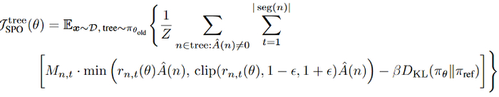 在得到段级优势值以后,为了进一步提高信用分配,团队创新性地提出 token 概率掩码策略优化方法,在策略更新仅将段级优势值分配给该段内的低概率(关键)token,而非所有 token。这种方法能更精确地将奖励 / 惩罚赋予关键的决策点,提升学习效率和效果。下面分别展示了 SPO-chain 和 SPO-tree 的优化目标。