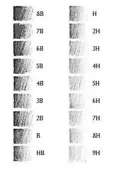 就这样,铅笔共有18个级别,其中HB则代表硬度和黑度都适中,从B到8B越来越黑但也越来越软,从H到9H则越来越硬也越来越淡。