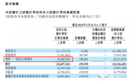 蔚来汽车财报显示,2025年第一季度,蔚来汽车的销售、一般及行政费用为44亿元,同比增长46.8%,环比下降9.8%。据了解,2024年第一季度,蔚来的这一费用为29.97亿元,2024年四季度则为48.8亿元。