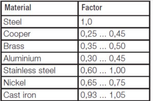 表 1.感应式接近感应的补偿系数。(表:巴鲁夫自动化)