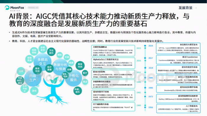 AI背景:AIGC凭借其核心技术能力推动新质生产力释放,与教育的深度融合是发展新质生产力的重要基石
