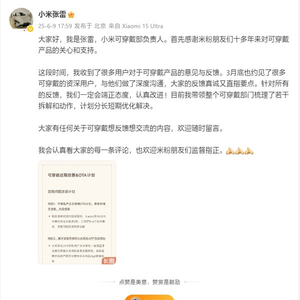 快科技6月9日消息,小米可穿戴部负责人张雷今天发文介绍,今期与不少用户进行了深度沟通,了解到了用户的真实反馈。