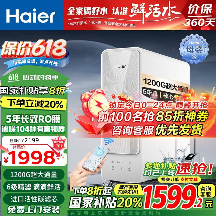 海尔净水器1200G鲜活水PRO京东优惠价1303.32