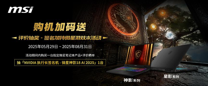 618大促的同时,购买微星游戏本指定新品+评价晒单,还有机会参加抽奖得到NVIDIA CEO – 黄仁勋亲签的神影18 AI 2025一台哦!