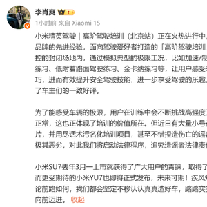 新浪科技讯 6月10日上午消息,小米汽车副总裁李肖爽在微博发文辟谣称,高阶驾驶培训(北京站)正在火热进行中,为了能感受车辆的极限,用户在训练中会不断挑战高强度工况,偶有状况发生属实正常,这也正体现了培训的价值所在。