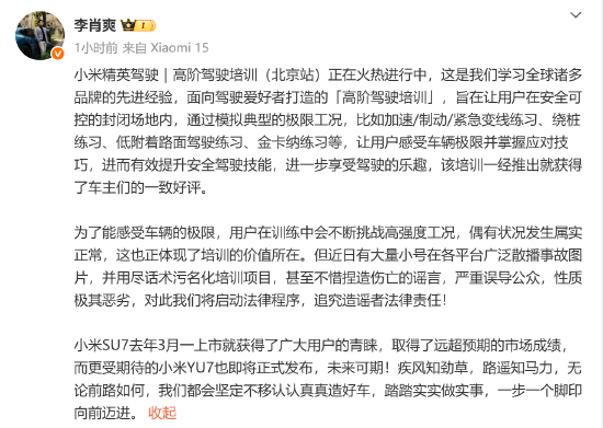 小米高管辟谣小米驾校出车祸:伤亡谣言误导公众 将追究法律责任