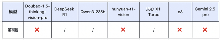 此外,所有参测的多模态大模型在第 6 题的图像识别上都出现了问题,这也暴露出当前 AI 在图文结合理解方面的短板。