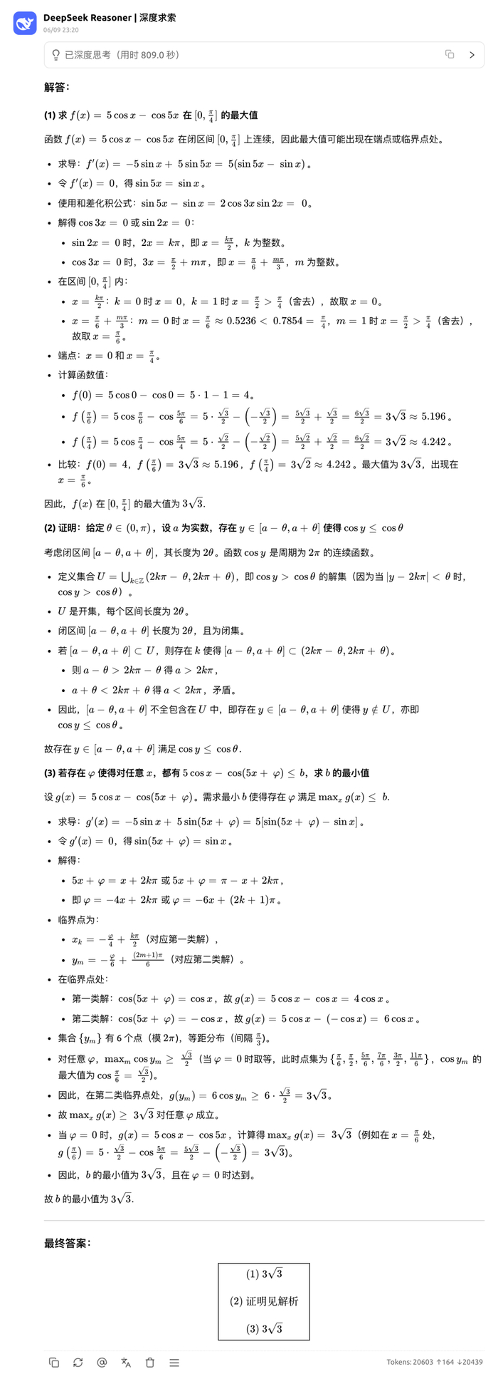对于最后一道压轴题,Gemini2.5 pro 是唯一全对的大模型。Doubao 只说明了震荡项的振幅大于 0,但是也有可能震荡项的相位是反的,那样的话最大值反而有可能更小,证明过程不够严谨,扣一分。