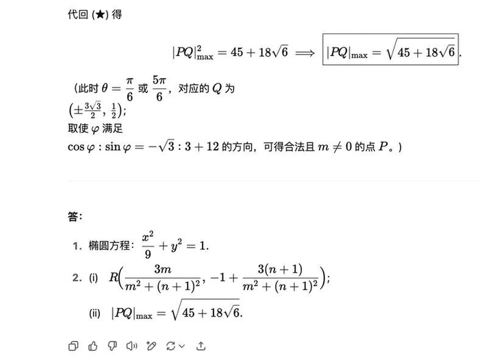 第 18 题这道椭圆方程与几何就难倒了不少大模型,仅 Doubao、DeepSeek R1 和 Gemini2.5 Pro 拿到满分 17 分,其他模型各有各的扣分点。Qwen3 前面回答得都不错,过程也很完整,但偏偏最后一小问|PQ|最大值取约等于 9 的步骤多余,导致结果偏差,扣了一分。