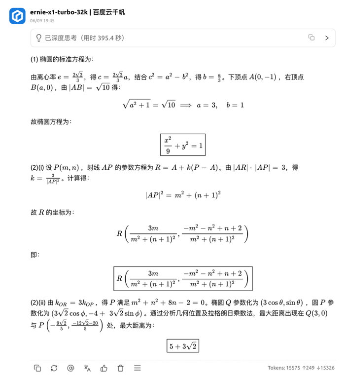 文心 X1 在第 2 问 (2) 正确算出 P 点轨迹,但未证明极值,直接按最远点计算造成结果错误,扣 6 分。