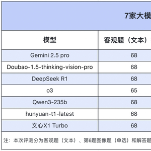 在不考虑识图题(第6题)的情况下,客观题大模型总体表现都不错,Doubao、Qwen3、Gemini 2.5 pro、DeepSeek R1 、文心 X1 Turbo 和 hunyuan-t1-latest 均取得了 68 分的高分,只有 o3 在多选题上少选了一项丢了分。