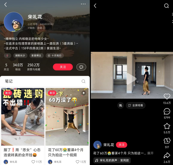 与其他装修博主不同,@宋礼花 的内容和人设更具特点,也更容易在小红书扎根。