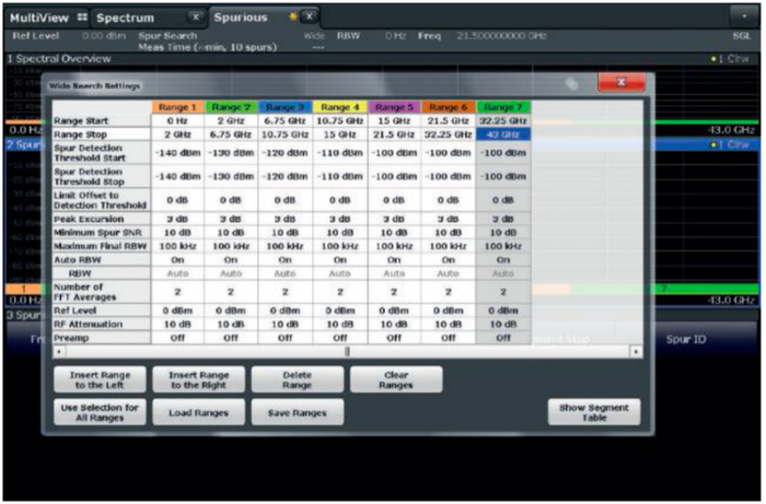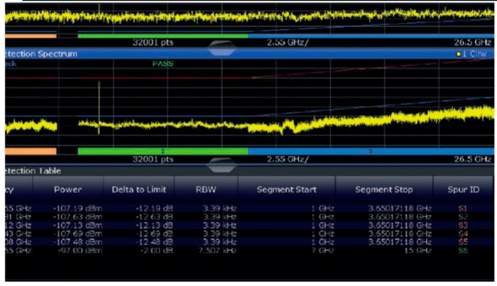 频谱仪是卫星杂散测试的核心仪器,用于测量杂散信号的频率、幅度等参数。这就意味着要在宽频率范围内检测极低电平的杂散。一般情况下,需要使用窄分辨率带宽 (RBW) 以便在高灵敏度下进行测量,但这样一来,测量时间要长得多。即使采用配备 FFT 滤波器的快速频谱分析仪,杂散检测也可能花费数小时甚至数天。罗德与施瓦茨公司提供一种新型杂散检测算法,可自动执行杂散测量并提高测量速度。罗德与施瓦茨公司超宽带频谱与信号分析仪R&S®FSW具有专门的宽带杂散测量选件K50,可通过三步法检测并确定杂散。首先通过快速扫描测定最佳RBW;然后进行二次扫描检测可能的杂散,每个已知杂散频率的最终高速搜索可确定峰值是实际杂散、噪声还是分析仪内部杂散;最后一步,进一步降低RBW以满足信噪比要求。