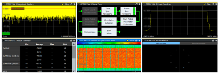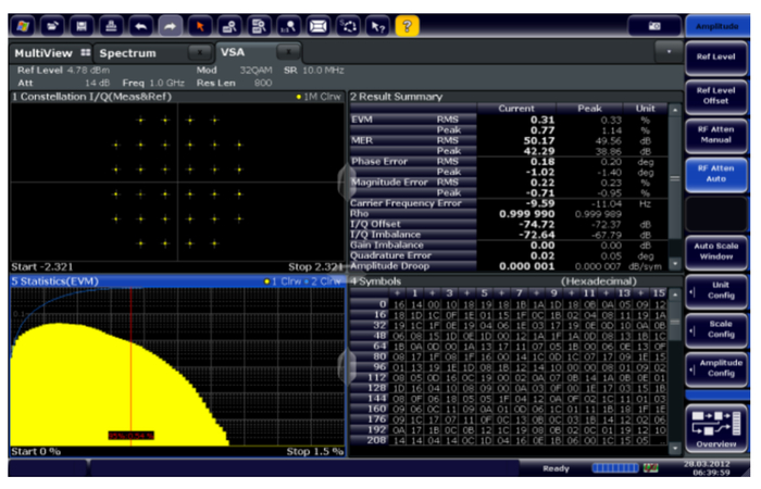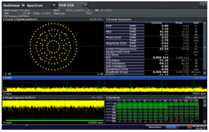 罗德与施瓦茨矢量信号源SMW200A支持DVB-S/S2/S2X/RCS2等多种数字视频广播卫星调制标准信号的产生。而DVB-S2X 信号针对有效载荷和帧头部分使用不同的调制方案。可以使FSW-K70 数字调制分析选件和K70M多调制标准分析扩展功能分析同一帧信号中不同调制方式信号。根据此配置,R&S®FSW 会根据同样的 I/Q 数据解调 DVB-S2X 信号帧头和有效载荷数据,并在不同的窗口中分别显示性能参数和星座图等。