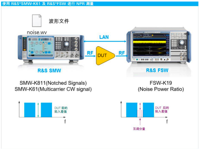 测试方法: 采用带陷波的宽带调制、宽带白噪声信号或者等间隔多音信号作为激励信号。待测器件输入该调制信号后,由于被测器件的非线性特性,会在被测器件的输出端产生互调失真,进而落入陷波内。通过测试通带内总功率谱密度与陷波中所有互调产物功率谱密度的比值,即可得到 NPR。