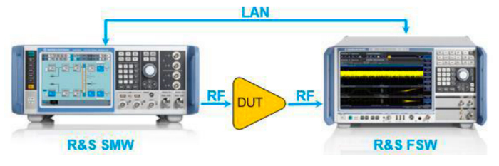 基于矢量信号发生器与矢量信号分析仪的测试将两者结合使用,如 R&S®SMW200A 矢量信号发生器及R&S®FSW矢量信号分析仪(配备R&S®FSW-K18选件)。R&S®FSW-K18可控制R&S®SMW200A,使参考信号与被测设备(DUT)发射信号同步,以获得准确测量结果。这种测量方法可使用连续波功率扫描或数字调制信号作为参考信号来测试设备,能分析高带宽的放大信号,还可通过直接数字预失真补偿记忆效应,借助参数扫描提供三维图表,用于快速查找 DUT 的最佳工作点。