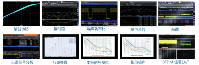 卫星主要测试项目包括 增益转移、互调失真、噪声系数、噪声功率比、相位噪声、杂散、群时延、矢量信号分析、OFDM信号分析 等,如下图所示。