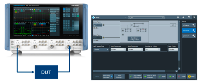另外,使用罗德与施瓦茨公司高端矢量网络分析仪ZNA集成的互调测试功能,也可以轻松测试三阶、五阶、七阶等互调指标,使用内置合路器,一个端口就可以输出双音信号,支持频率、功率和双音间隔多种扫描方式,并提供专门的测试向导,测试更加方便。同时功率校准保证了互调点的测试精度。而且高端矢量网络分析仪ZNA独特的内部四源配置,还能够支持变频条件下的互调测试。