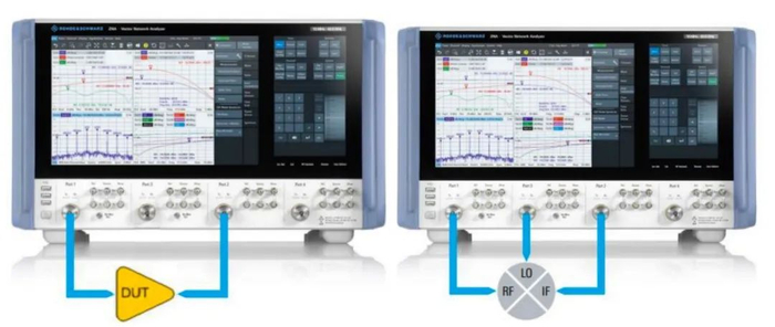 在测试传输特性时也可使用矢量网络分析仪,支持变频和非变频元件及组件在连续波或脉冲调制下的测试,支持有源器件的非线性测试。变频增益或插入损耗的测试方法连接简单,设置灵活,多个内置源配置条件下,支持一级、二级变频模式。当DUT的本振信号无法接入时,测量时会存在一定的频偏,而罗德与施瓦茨公司的矢量网络分析仪ZNA配置本振频率跟踪功能,可以自动纠正信号频偏保证测量结果的准确性。