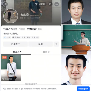 日前,世界纪录认证机构(WRCA)官方发布,截至2025年6月7日22:00,韦东奕抖音账号粉丝已突破1900万,视频点赞数超千万,经世界纪录认证机构正式确认为“72小时内抖音平台学术领域获得粉丝最多的人”。