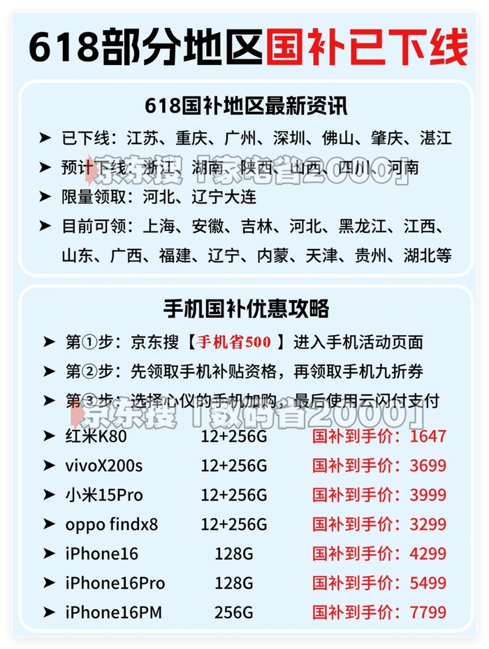 * 高危预警:江苏、重庆等地因额度紧张,启动每日限量发放,需通过京东APP搜“手机省500”或“数码省2000”锁定资格。