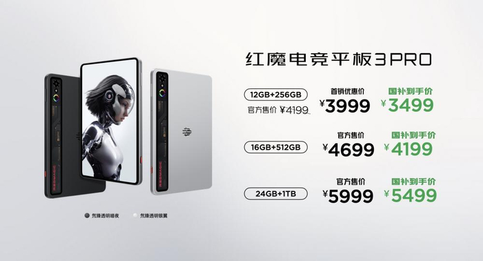 红魔电竞平板3 PRO首发推出三档配置供用户挑选搭配,国补后还有惊喜价格: